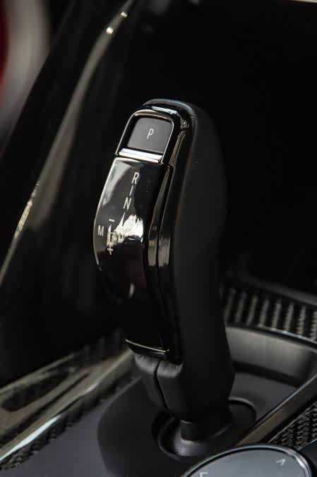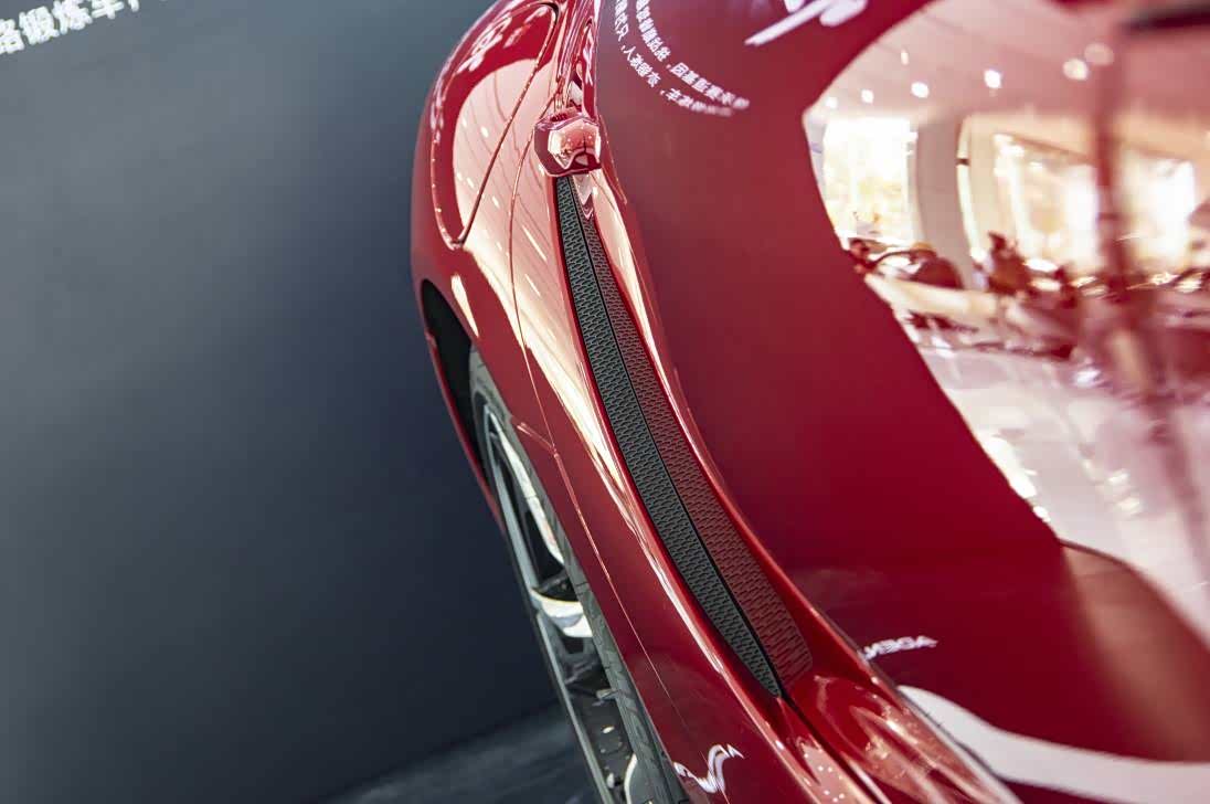 车头的设计依旧选用了造型夸张的空气动力学设计,下方三块大面积的黑色菱形网状进气格栅造型在做气流引导的同时也加强了中冷的散热效率。车灯的造型设计配合机盖线条向整车的中间聚拢,只看一眼你也会知道这是一种仿生学的设计元素,而并非为了好看。