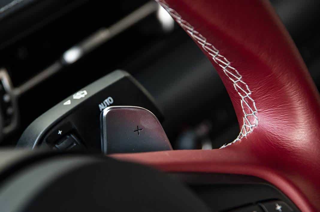 换挡拨片面积比较大,质感温润,按压一下回弹很快,干脆利落。