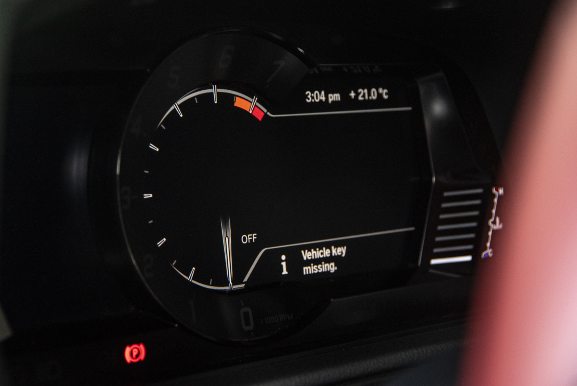 仪表盘设计从表面上看虽然是一套全液晶仪表,似乎会与这样一台机械感出众的车型略有不搭,但点亮后你会看到在正中间的圆环上就是它的转速区,在运动氛围的营造上没有任何问题。
