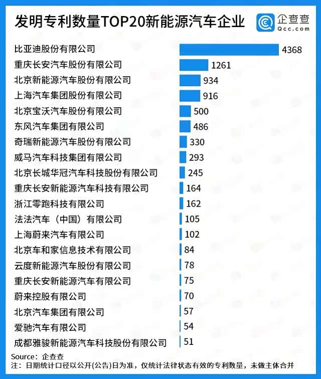 其次在发明专利数量 TOP20 新能源汽车企业榜单上,比亚迪依旧以 4368 件专利登上冠军宝座,长安汽车与北汽新能源位居第二和第三名,专利数量分别是 1261 件与 934 件。在造车新势力企业当中,威马汽车以 293 件专利拿到榜单第 8 的成绩,同时在造车新势力当中排第一。值得注意的是,法拉第未来全资子公司法法汽车(中国)有限公司亦榜上有名,发明专利达 105 件,仅次于零跑汽车的专利数量,在榜单当中排名 12 位。