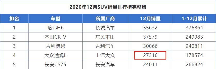 在过去很长一段时间里,紧凑型SUV市场老大的位置都被老途观牢牢占据,而随着途观L的到来,它又成为中型SUV市场的老大。以去年12月为例,途观L销量达到27316台,是12月SUV销量榜前五中唯一一台中型SUV,其全年销量达到178574台,超越本田冠道、丰田汉兰达等同级竞品,成为国内中型SUV销量冠军。那么,途观L到底有何魅力,能吸引如此多的用户呢?