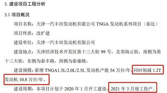 消息的起源应该是源自天津技术开发区公布的一组项目工程报告,可以看到一汽丰田正在对其天津发动机工厂进行改造,信息显示工厂将新增TNGA 1.5L/2.0L/2.5L发动机产能54万台/年,同时削减1.2T发动机产能10.8万台/年,项目将于今年3月竣工投产。