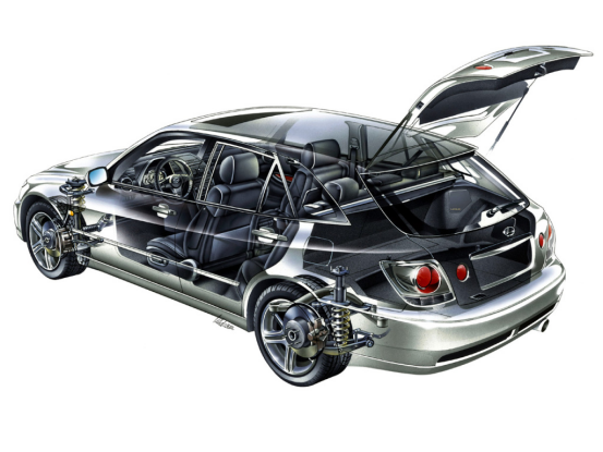 说到Lexus IS的发展史,当然也就绕不开丰田Altezza这款车,Altezza的名字来自意大利语,意思是“高贵”,用以命名一辆主打运动、操控的车型似乎有点儿格格不入,但丰田的市场部也确实很有心思,用这个名字命名一辆运动化的车型刚好能洗脱丰田FR车型那种“前不近村、后不挨店”的尴尬位置,当时丰田的FR车型主要以舒适豪华为主,80年代推出的Levin/Trueno(AE86)也只是Corolla的运动型号,而后的AE90等已经换成前轮驱动;而当时的第七代Mark II又过于轿车化,确实很难实现在Lexus品牌下销售的目的和目标。于是,由片山信昭(Nobuaki Katayama)领导的工程团队在1994年开始对Altezza及未来的IS车系进行重新搭建,项目代号038T,而此君也正好是当年AE86的工程师。从轴距看,1998年10月推出的Altezza轴距为2670mm,而当时在售的第八代Mark II的轴距则为2730mm,加上两者的悬挂设计形式几乎一样,可以推断,Altezza与Mark II(X90)、甚至跟已经停产的Supra A80存在着一定的血缘关系,只是几者所走的路向不同,Altezza的外观设计由Tomoyasu Nishi负责,也让Altezza增添了一份欧洲车的造型,更符合当地的审美观。Altezza于1998年10月正式在日本国内上市,至2005年7月停产,挂有Altezza的车型合共销售了11.14万辆。