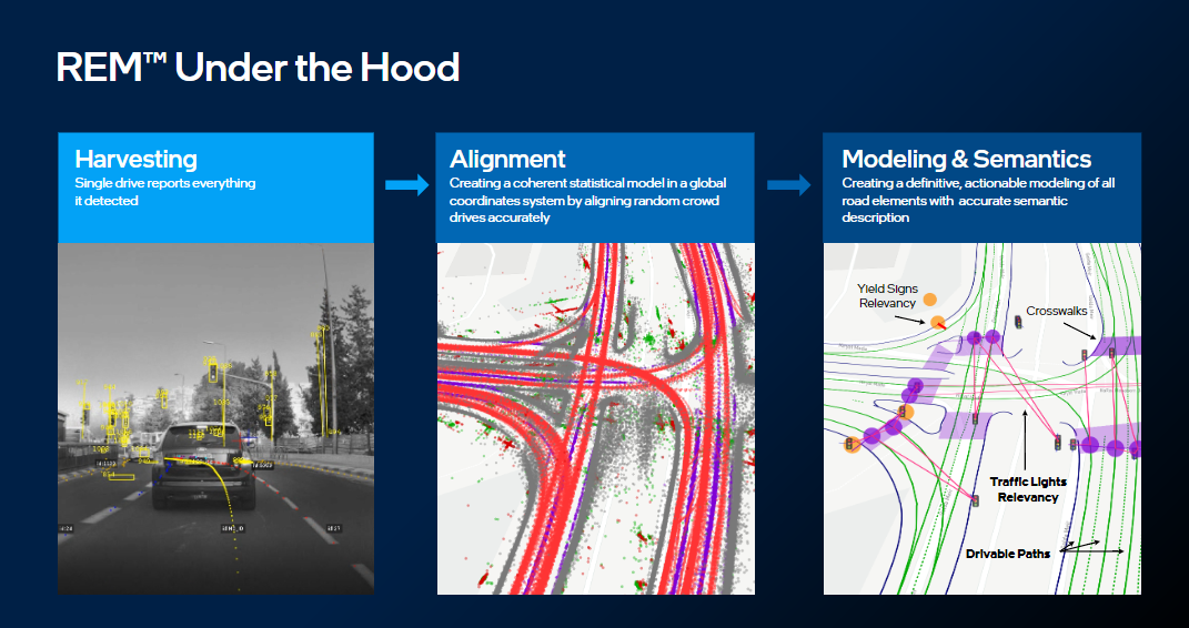 Mobileye花费5年时间开发高精地图,它不是通过专门的车辆收集数据建模,而是利用REM (路网信息管理)技术,通过众包来完成。它们并不是真正的地图,也不是导航地图,它包含场景中有关场景的一切信息,并理解语义信息。这种方法解决了高精地图两方面的问题。