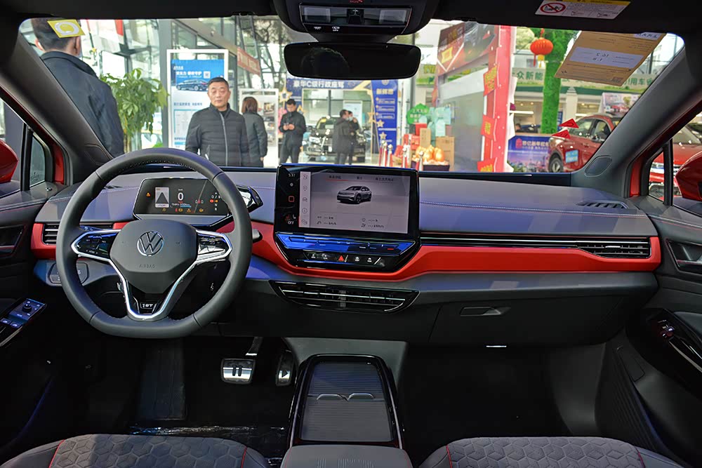 同外观一样,上汽大众ID.4 X的内饰同样以简约设计为主,新车内饰摈弃了大量的物理按键,大尺寸悬浮式触控屏、全触控式的功能操作与语音交互带来了强烈的科技感,而集成了档杆的液晶仪表盘更是十分前卫。此外,新车内饰采用了大量皮革覆盖,局部钢琴烤漆与镀铬装饰以及多色氛围灯带来了不少豪华感,并且新车内饰还提供了多种不同配色可选,本次实拍车型采用了极具运动感的红黑双拼色装饰。