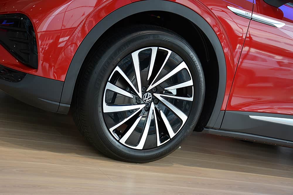 轮胎部分,本次实拍上汽大众ID.4 X配备了尺寸为235/50 R20的固特异EFFICIENT GRIP御乘系列,与之搭配的20寸双色铝合金轮圈造型也颇为动感。