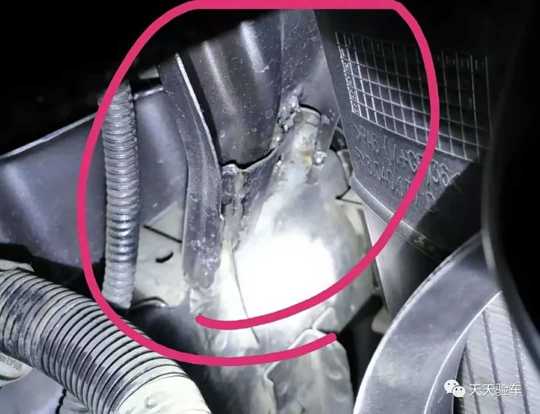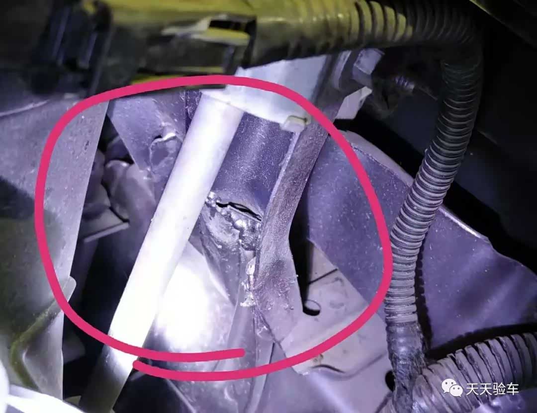 这个没记住什么车了,大家知道水箱框架有塑料的,也有铁质的,一般铁质的无法拆卸,维修的话的切割,上图就是切割了水箱框架,并且焊接很一般;