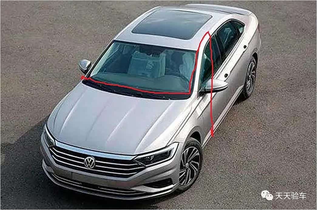 这是一台大众车,只有八百公里,内饰及发动机非常的新,但是从测量的数据看明显异常,扒开之后发现这是一台拼接车,就是说车头与中后部拼接,切割位置大概如图;