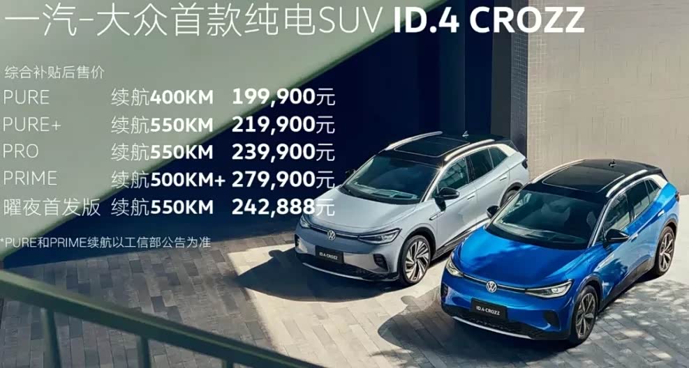 近日,南北大众相继发布旗下首款纯电动平台车型ID.4系列的售价。其中, 一汽-大众ID.4 CROZZ售价19.99-27.99万,上汽大众ID.4 X售价19.99-27.29万。结合当前国内竞争格局,大众准确拿捏25万纯电动汽车消费节点,可谓老辣得道。