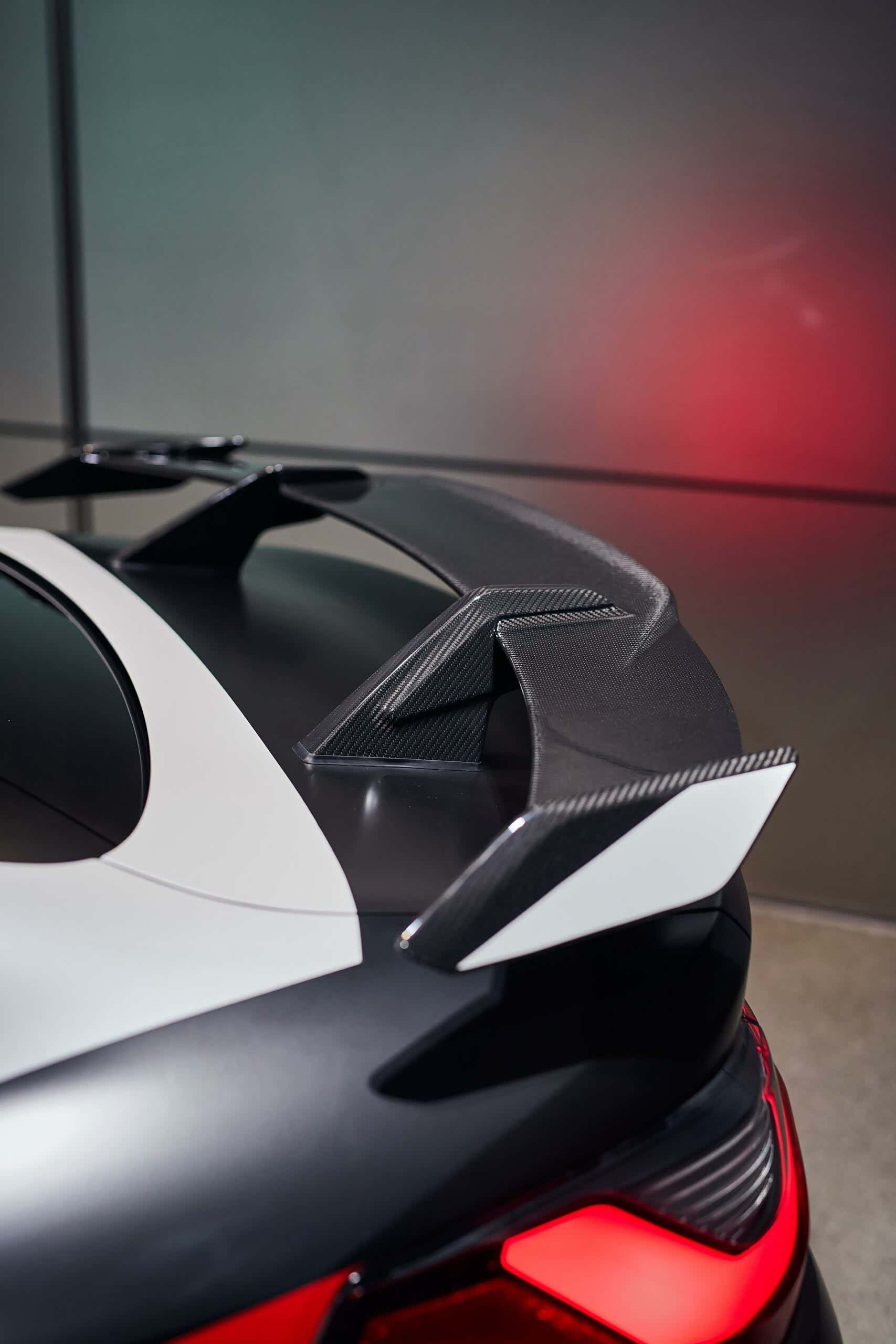 而在车尾部分,醒目地高高翘起的碳纤维尾翼定下了运动的基调,而与车头和侧面都不相同,整个车尾完全采用了哑光黑色的车漆涂装,配合尺寸巨大的碳纤维后保险杠及中置四出排气,将性能车的特质强化到极致,不论走到哪里都是道路上的焦点。