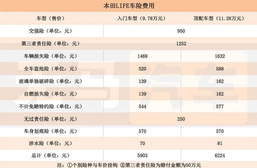 目前本田LIFE共计推出4款车型,指导价为9.78-11.28万元,而个别险种是与车型售价挂钩的。经过计算,本田LIFE的入门车型的保险费用为5903元,而顶配车型的保险费用为6224元。当然,如果没有出险的话,后续的保险是会逐年下降的,因为这里计算的是全险,所以会比较贵一些,我们就姑且先算本田LIFE每年的保险费用为5903元。