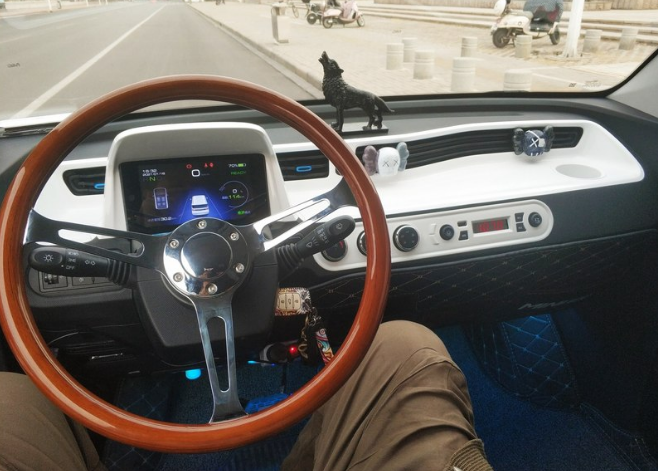 车主这台是四座版宏光MINI EV,车身颜色改为了双色,并且进气格栅也有贴纸,车标也换成了银色的,也许最特殊的就是轮毂了,这个复古的轮圈还是很有意思的,其实这还不算什么,最主要的是内饰。