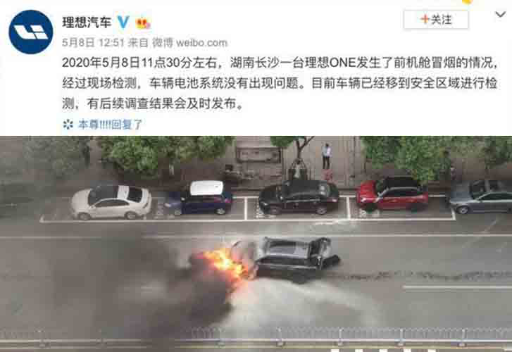 在去年5月份,湖南长沙发生了理想one的“自燃事件”,根据现场照片显示,理想one的引擎舱内有明火冒出。而在官方微博中,理想汽车却将此次事件表述为“前机舱冒烟”。