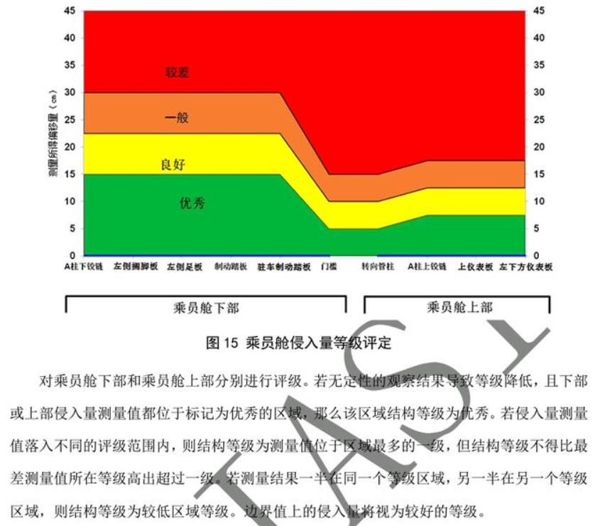 查阅中保研的测试规范,《正面25%偏置碰撞评价规程CIASI-SM.PI.SOT-A0》中对于乘员舱侵入量等级评定有着明确的说明。其中,照片中肉眼可见的A柱下铰链、A柱上铰链、门槛都是测量点之一,每个测量点均有对应的偏移量和评级标准。