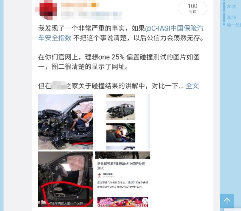 对比“内部摸底测试车”与中保研测试后的车辆状况,前者显然A柱更加完好,门槛形变更小。而在各家媒体的报道中,只有部分媒体明确强调了该车的真实身份。站在路人群众的角度看,将“内部摸底测试车”误认为就是中保研实测车辆的误会难以避免,微博中的相关言论也证实了误解的发生。