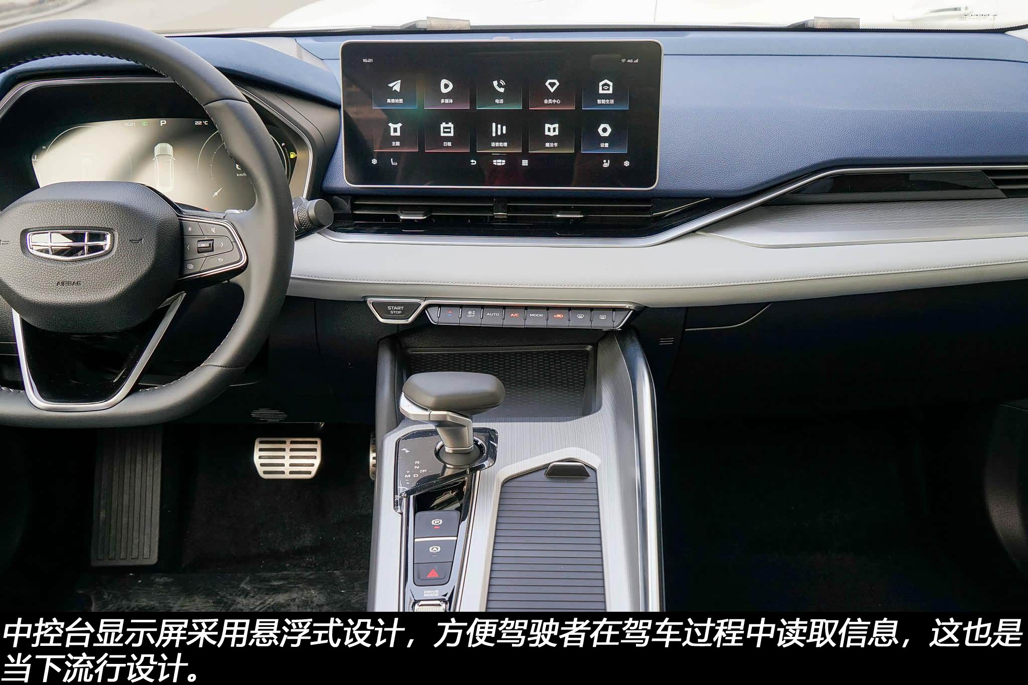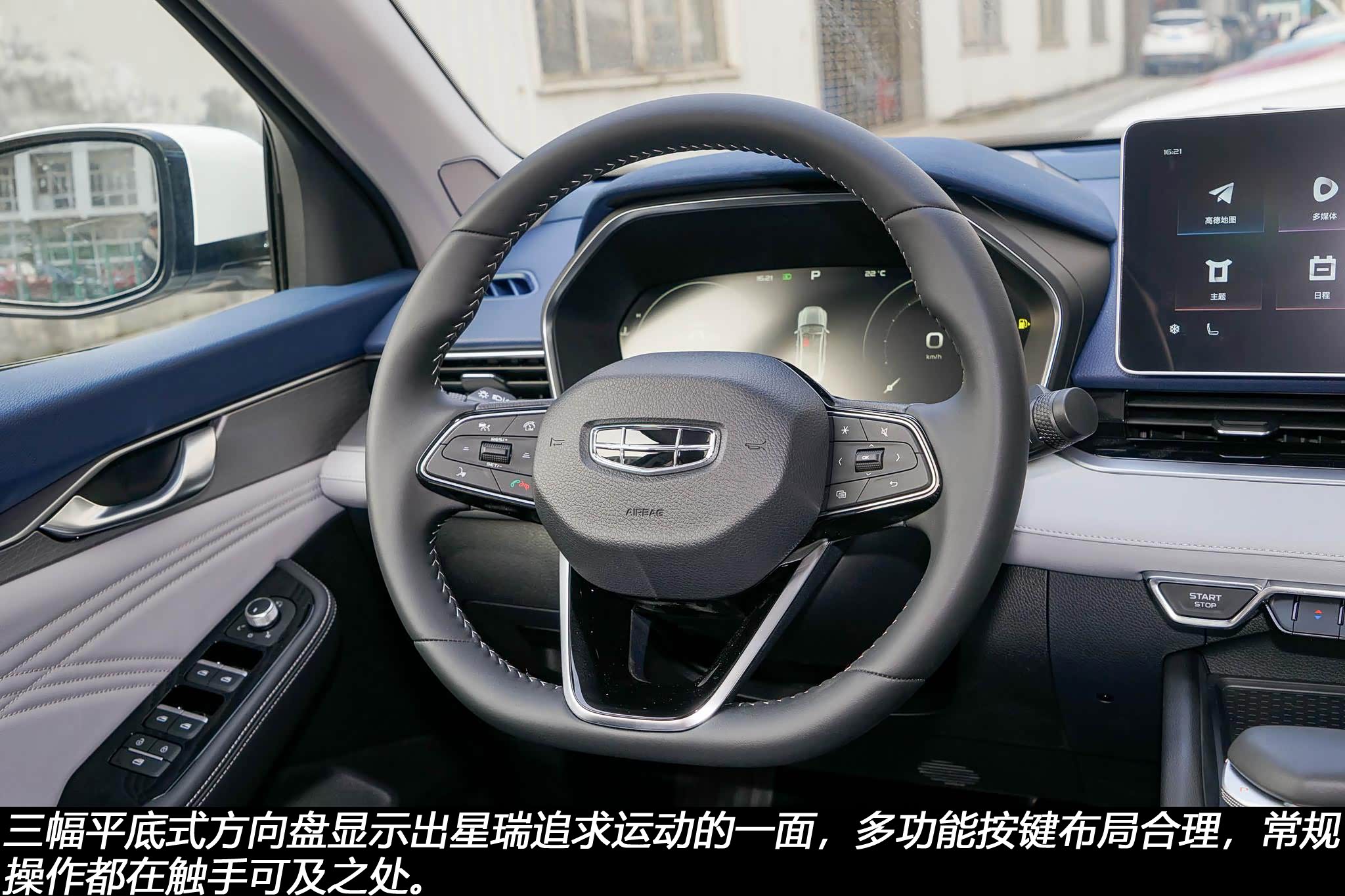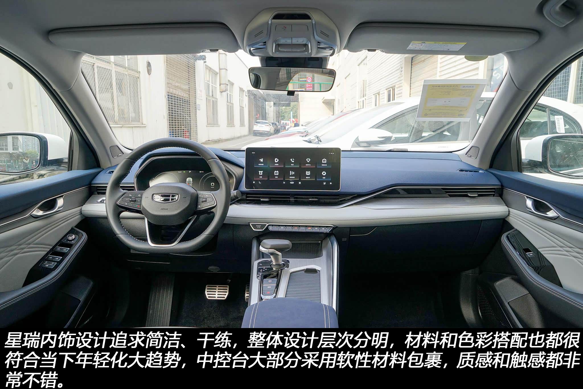 星瑞内饰设计追求简洁、干练,整体设计层次分明,材料和色彩搭配也都很符合当下年轻化大趋势,中控台大部分采用软性材料包裹,质感和触感都非常不错。三幅平底式方向盘显示出星瑞追求运动的一面,多功能按键布局合理,常规操作都在触手可及之处。12.3英寸全液晶仪表盘可以根据驾驶模式切换显示风格。中控台显示屏采用悬浮式设计,方便驾驶者在驾车过程中读取信息,这也是当下流行设计。中控台空调控制区域保留了常规实体按键,让驾驶者可以轻松进行盲操作,拥有不错使用体验。