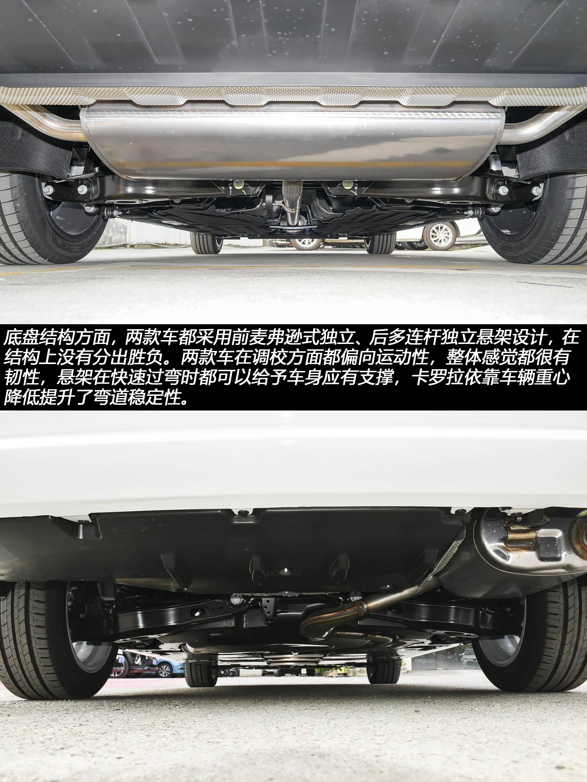 底盘结构方面,两款车都采用前麦弗逊式独立、后多连杆独立悬架设计,在结构上没有分出胜负。两款车在调校方面都偏向运动性,整体感觉都很有韧性,悬架在快速过弯时都可以给予车身应有支撑,卡罗拉依靠车辆重心降低提升了弯道稳定性。