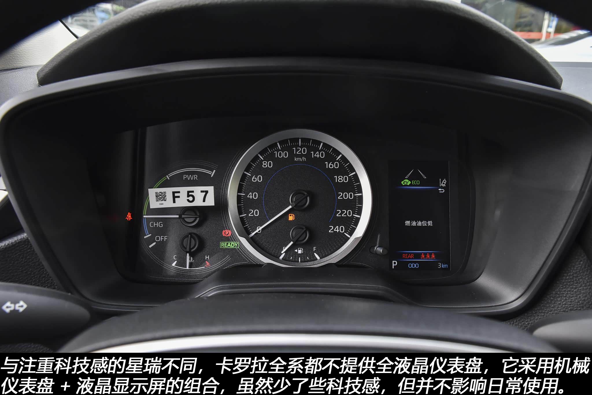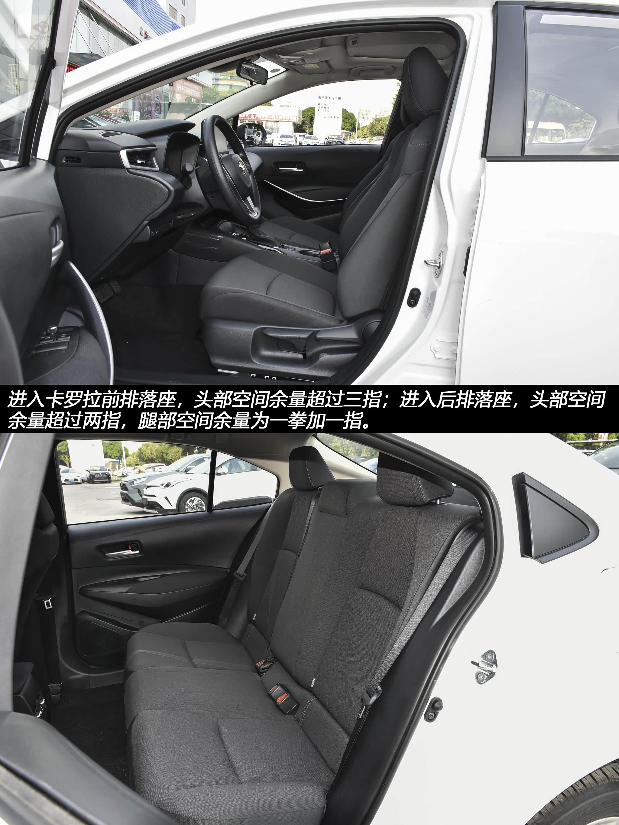 车身尺寸方面,虽然两款车都是紧凑车定位,差距并不算小。星瑞的长宽高分别为4785mm、1869mm、1469mm,轴距2800mm;卡罗拉双擎为4635mm、1780mm、1455mm和2700mm;前者在轴距上有100mm的优势。身高1.8米的标准身材成年人进入星瑞前排落座,头部空间余量两指;进入后排落座,头部空间余量三指,腿部空间余量一拳加四指。进入卡罗拉前排落座,头部空间余量超过三指;进入后排落座,头部空间余量超过两指,腿部空间余量为一拳加一指。从整体乘坐空间表现来看,星瑞的优势在后排腿部空间,卡罗拉更均衡,头部空间有优势。