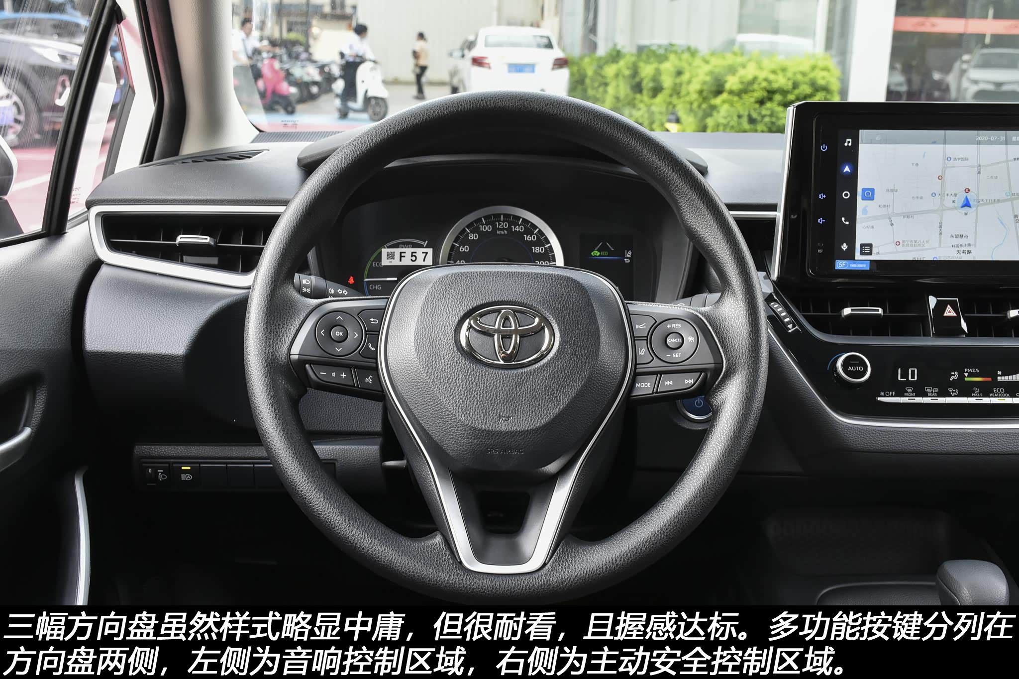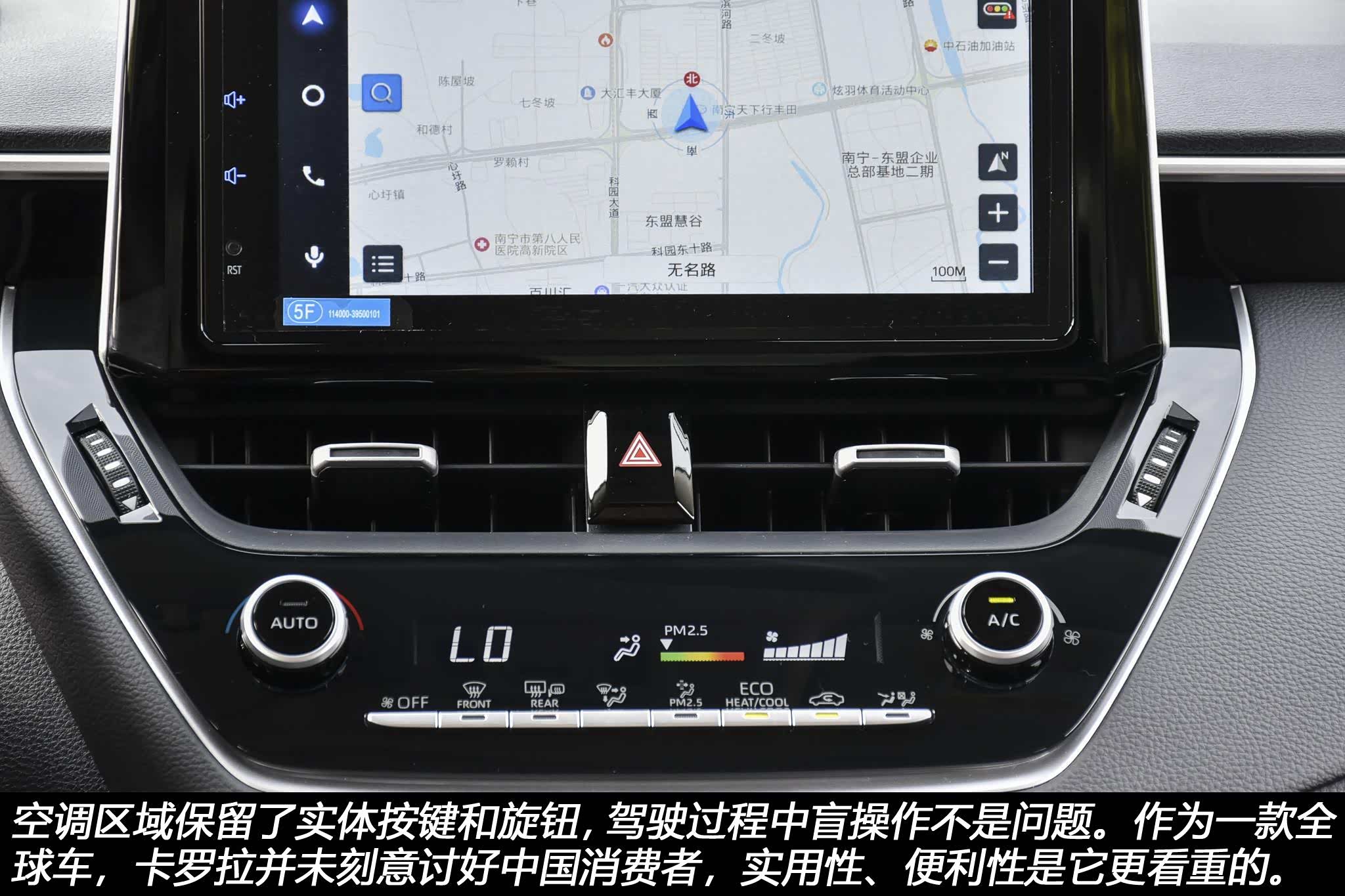 卡罗拉的内饰设计同样追求简洁,它通过直线划分出应有的分区,立体感和设计感非常不错,且质感和触感也都达到同级别车应有水准。三幅方向盘虽然样式略显中庸,但很耐看,且握感达标。多功能按键分列在方向盘两侧,左侧为音响控制区域,右侧为主动安全控制区域。与注重科技感的星瑞不同,卡罗拉全系都不提供全液晶仪表盘,它采用机械仪表盘+液晶显示屏的组合,虽然少了些科技感,但并不影响日常使用。中控台液晶显示屏采用悬浮式设计,提升了内饰科技感,读取信息也很方便。空调区域保留了实体按键和旋钮,驾驶过程中盲操作不是问题。作为一款全球车,卡罗拉并未刻意讨好中国消费者,实用性、便利性是它更看重的。