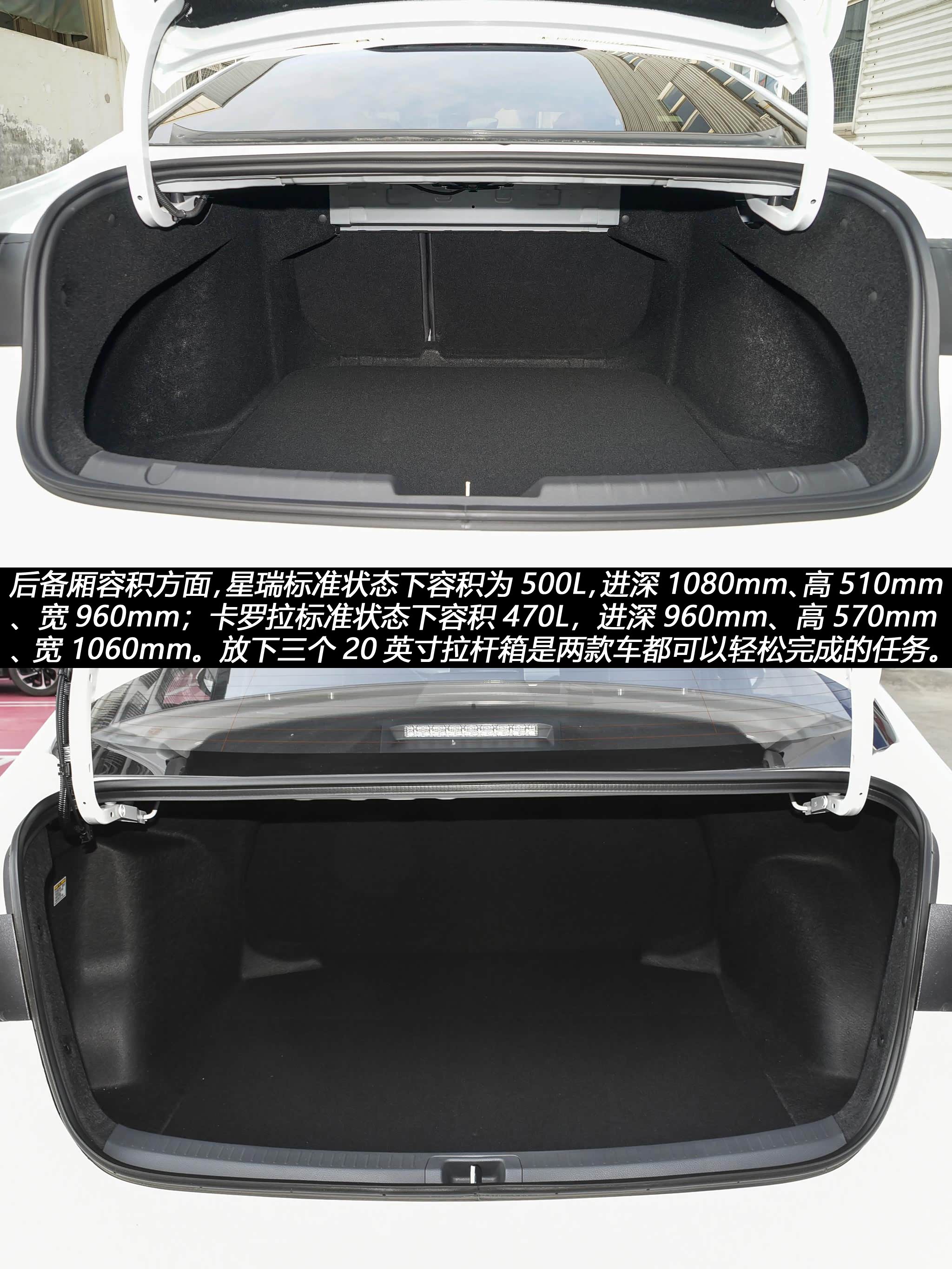 后备厢容积方面,星瑞标准状态下容积为500L,进深1080mm、高510mm、宽960mm;卡罗拉标准状态下容积470L,进深960mm、高570mm、宽1060mm。放下三个20英寸拉杆箱是两款车都可以轻松完成的任务。