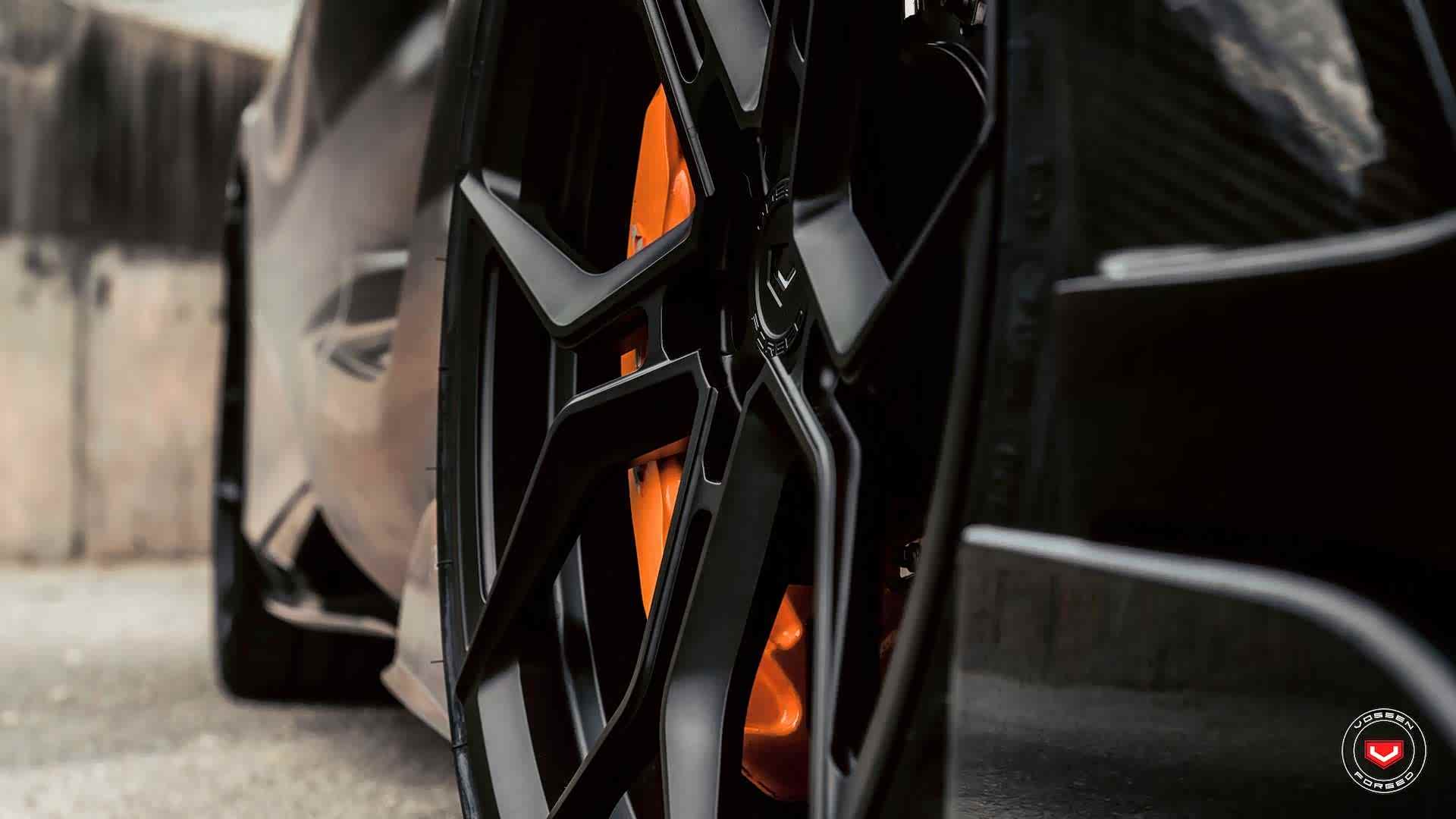 迈凯伦765LT的外观采用渐变车漆,从车头的黑色渐变为Nardo灰,这样的处理速度感十足,搭配上Vossen Evo-3锻造轮圈,前轮尺寸为20英寸,后轮为21英寸,拥有48种颜色可供选择,同时提供19到24英寸的规格,每个轮毂的价格为1800美元起,是不是看上去很帅。