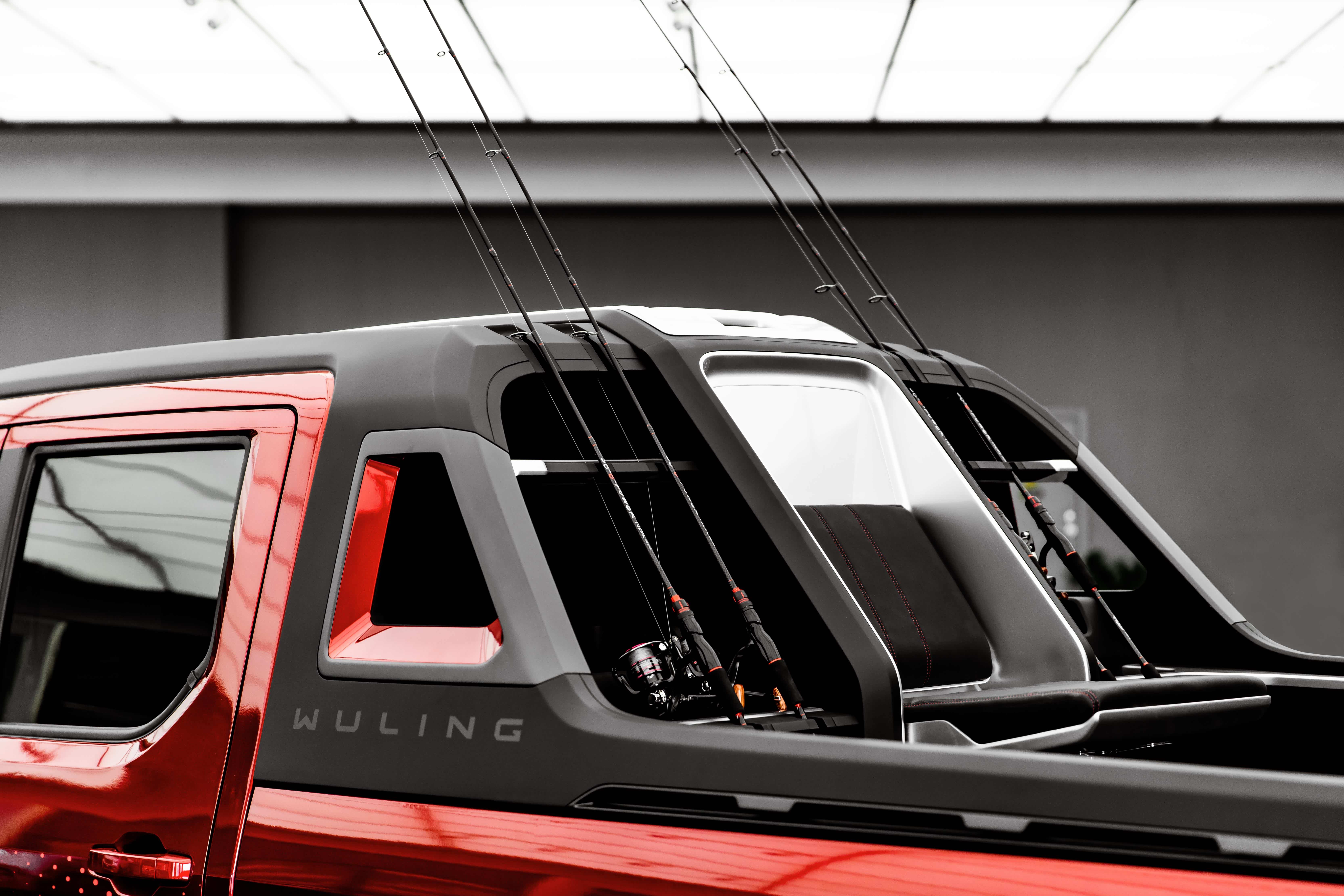 货箱上的龙门架一体可拆卸,采用灰与哑光黑配色,另外还配备了卡槽方便收纳鱼竿;下端包覆货箱,并安装了侧挂钩有利固定货物。货箱内也是别有洞天,哑光银金属感装饰和五菱logo的点缀显得十分别致。功能上,具备可折叠座椅供人户外垂钓,座椅两侧还安装了鱼竿卡槽,以便静置鱼竿,货箱内侧两边均有侧扶手,可放置物品。