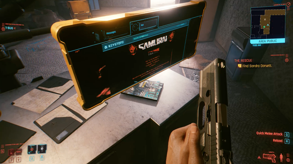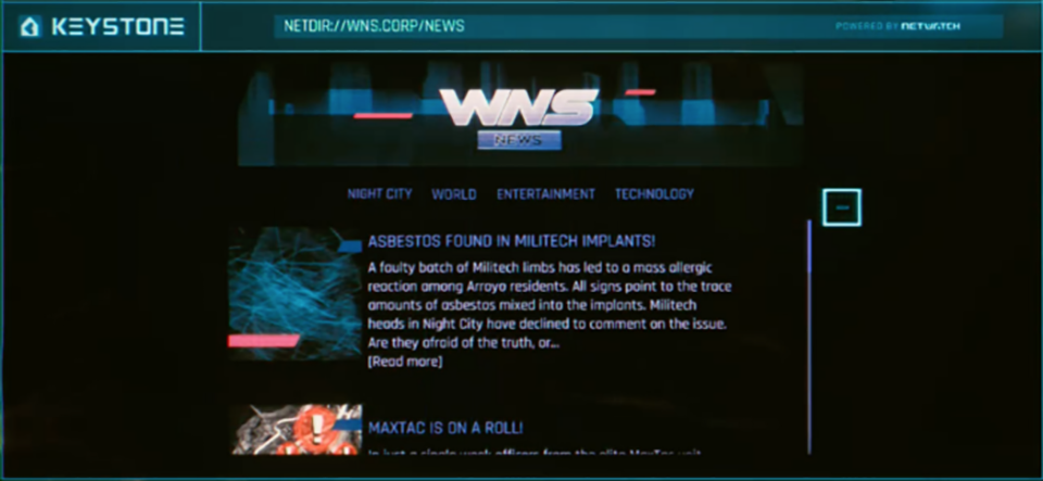 很显然,2077年的互联网是在向90年代末致敬。我记得1998年建立了我的第一个网站,Cyberpunk的电脑上的网站都是遵循同样的设计模式。也就是说,导航要适合640x480像素,CRT 4:3显示。