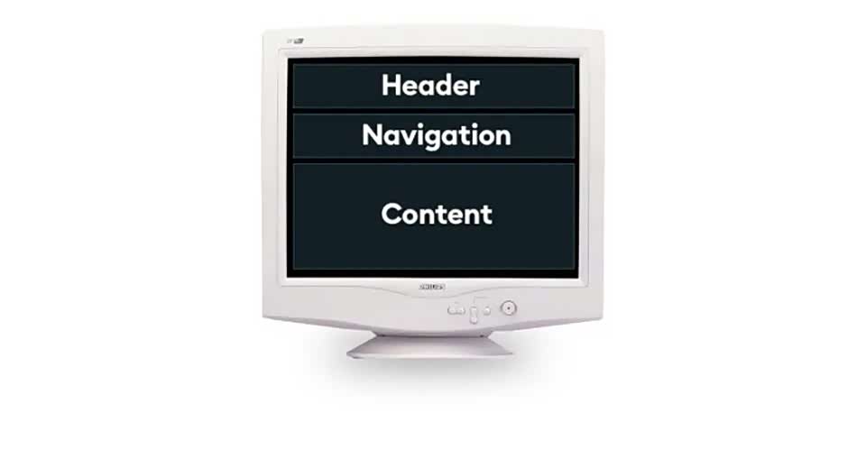那个时代的几乎所有网站都有一个横向的、非常直观的标题,贯穿整个路径。他们调整了水平、全宽度的导航,将剩下的空间留给内容,主要是一列。因此,我看到了2077年的显示器上出现了完全相同的东西,而且肯定更大了。