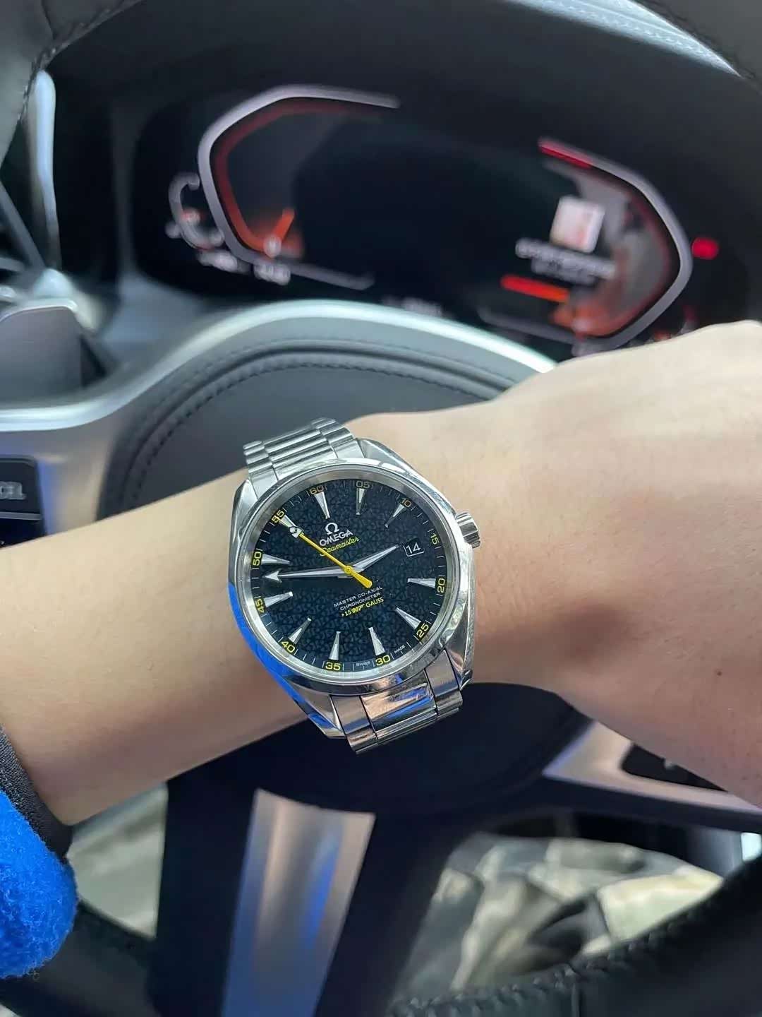 325i搭配欧米茄海马系列联名007,表盘布满了007的徽章,此款的背透是詹姆斯邦德的枪膛设计,看到的第一眼就被深深吸引,虽然邦德的标配是马丁,不过我还是选择了BMW(向金钱低头了,哈哈)。