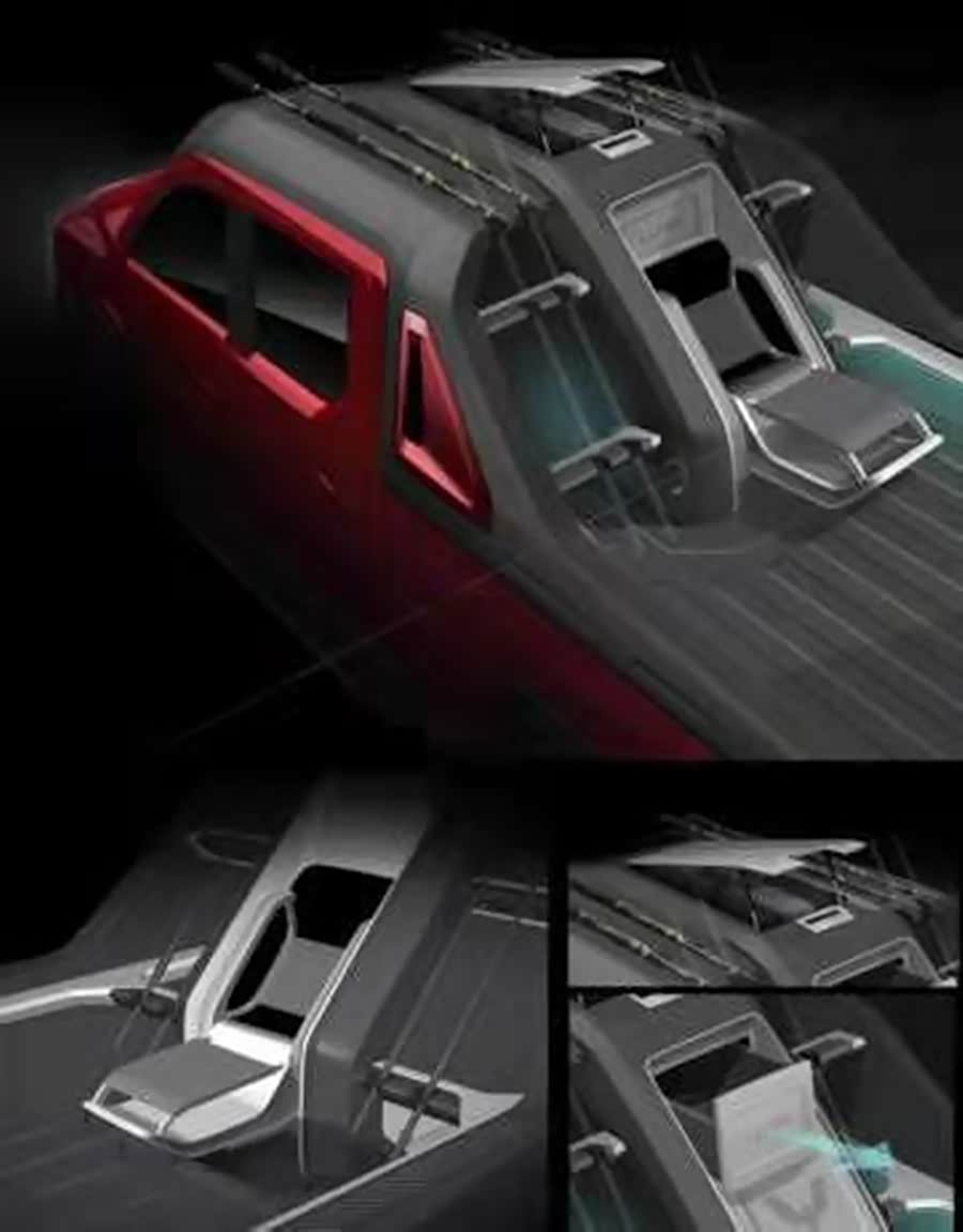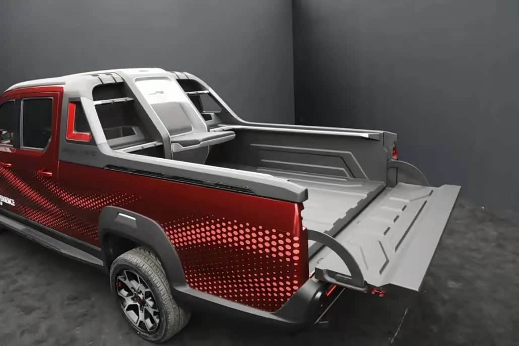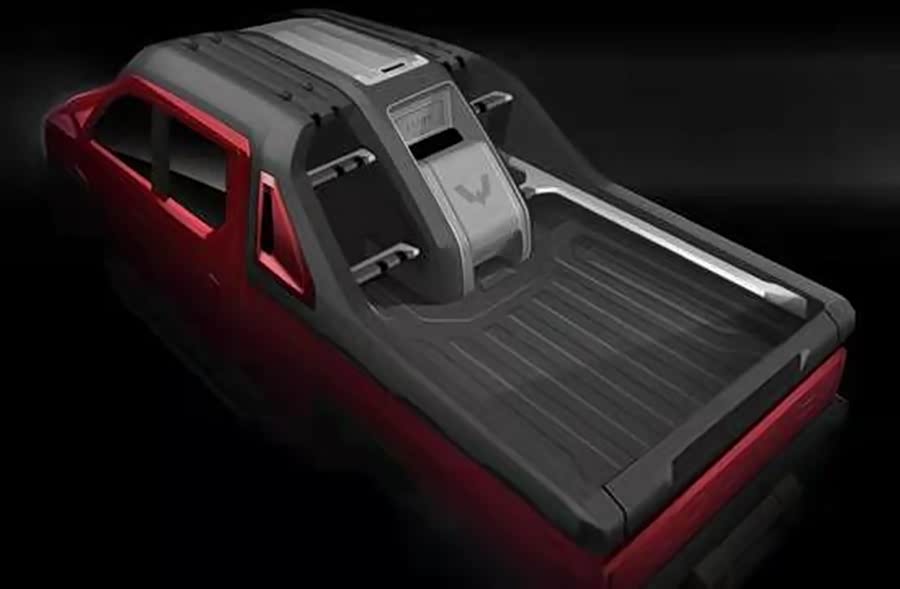 而既然是改装版皮卡,新车的货箱部分自然是重点,配有一体化可拆卸式龙门架,采用了灰色和黑色混搭的配色,从车顶延伸至货箱,龙门架上还装配有卡槽和侧挂钩来增加使用便利性。