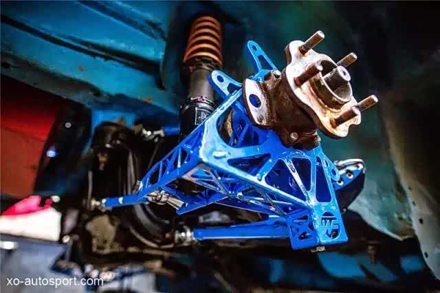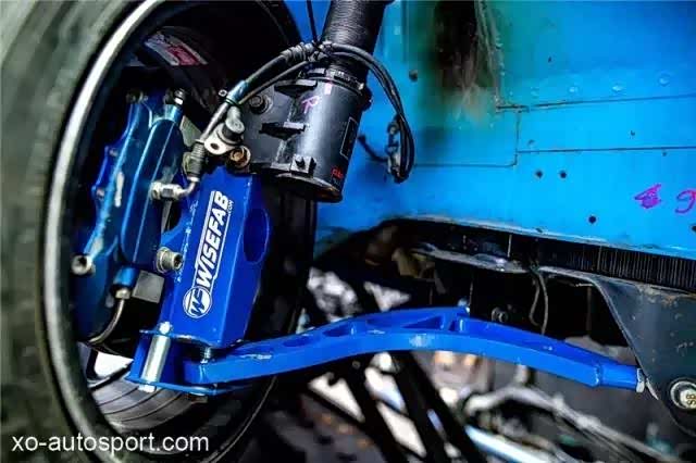 关键的亮点是底盘,原本钢板弹簧的硬桥悬架也可用于飘移,但为了有更多的可调设定和更激进的横走动作,于是移植了日产A31的后悬挂总成,并更换上WISEFAB轻量化和大角度的摆臂连杆,其实车主也尝试过使用GT-R R33后悬,虽然强度更高但簧下重量就变大了,对于比赛来说会有反效果。