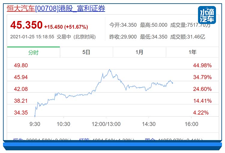 消息一发布立刻引起资本市场的狂欢,1月25日早间,恒大汽车早盘高开14.88%,股价报34.35港元,总市值3028亿港元。截止发稿前,恒大汽车股价涨幅超50%,市值近4000亿元,即3998.32亿元。在国内17家上市车企中,排名第三,仅此于比亚迪和蔚来。而在2020年1月初,恒大汽车市值才仅有500亿元。