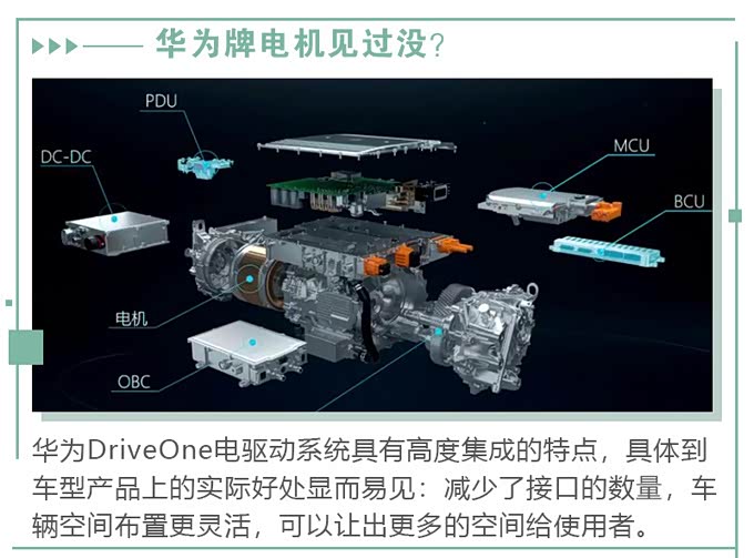 先来说说华为电机,华为大家肯定都非常熟悉,我用的手机、家里的路由器、公司的笔记本电脑都出自华为品牌,但是华为品牌出品的用在汽车上的电驱系统,这还是我第一次见到。华为这套高度集成的电驱动系统名为“DriveONE”,在去年(2020年)北京车展上首次发布,官方的说法是集成了电机、MCU(微控制单元)、减速器、DCDC(直流变换器)、OBC(车载充电机)、PDU(电源分配单元)、BCU(电池控制单元)七大部件,实现了机械部件和功率部件的深度融合。