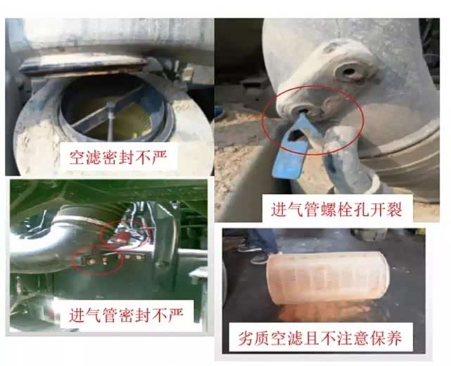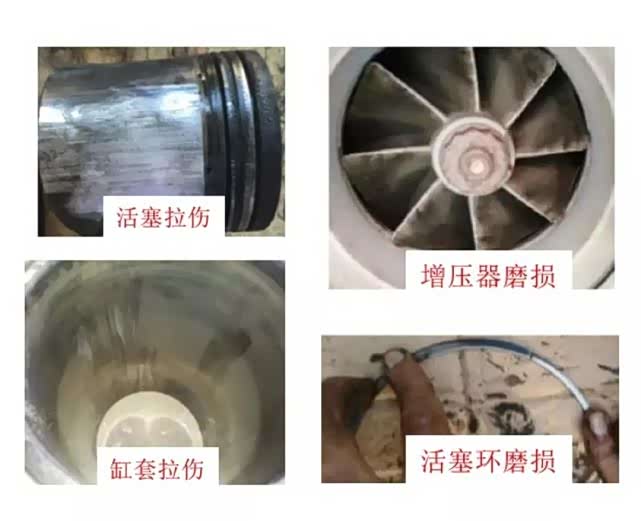 注:涡轮增压空滤密封不足、进气管螺栓孔开裂、进气管密封不严、劣质空滤且不注意保养都会导致压器磨损、活塞环磨损、活塞拉伤、缸套拉伤等。