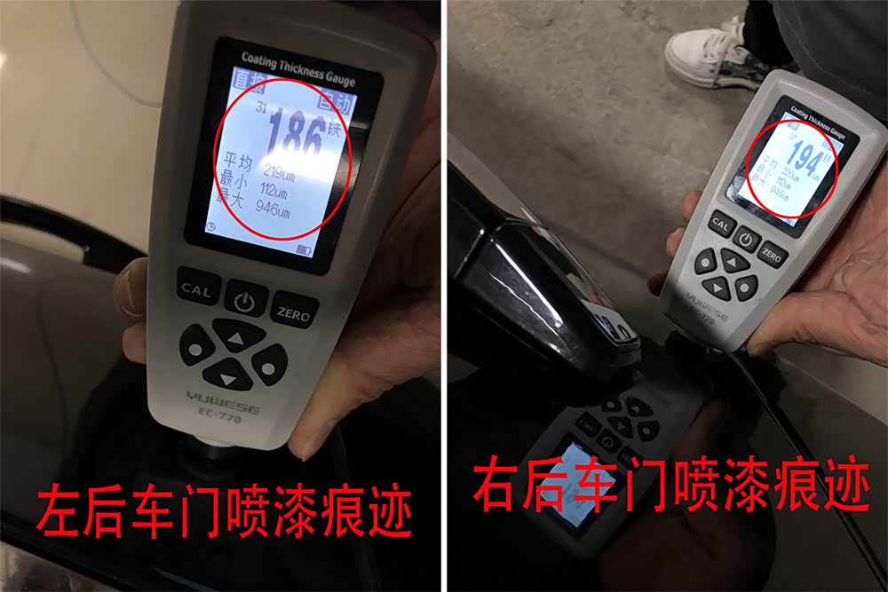 滴..滴..一下一下的测量着车辆每一个漆面位置,车商说的暂时看来还没什么问题,除了全车大喷之外还真没发现钣金的痕迹。