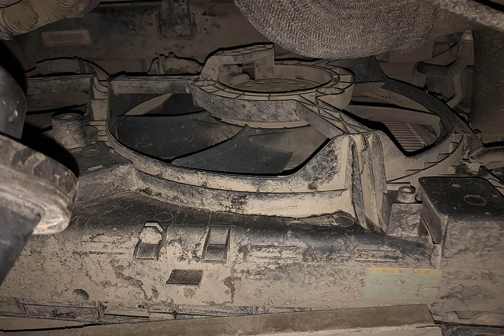 透过散热器风扇可以看到前部防撞钢梁的位置,未发现异常和修复的痕迹,基本可以排除发动机舱前部存在碰撞事故的可能。