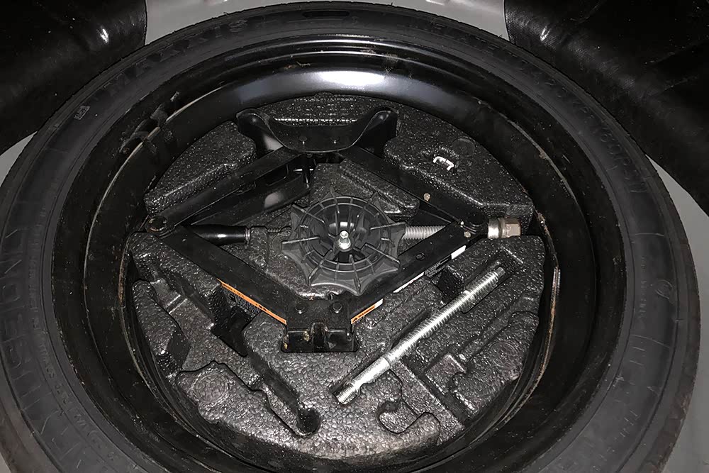 掀开后备箱底板,检查备胎没有下地使用的痕迹,随车工具缺少灭火器。