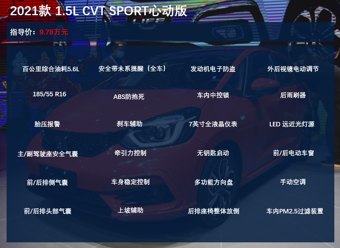 首先,2021款 1.5L CVT SPORT心动版车型作为入门车型,它的价格只有9.78万元,且基础配置较为丰富。7英寸液晶仪表、16英寸铝合金轮圈、前排侧气囊和全LED大灯等配置它都有。并且这款车型和本田飞度的入门车型相比,在价格上要贵一些,不过性价比却要高不少。所以我认为这款车型还是比较值得推荐的。