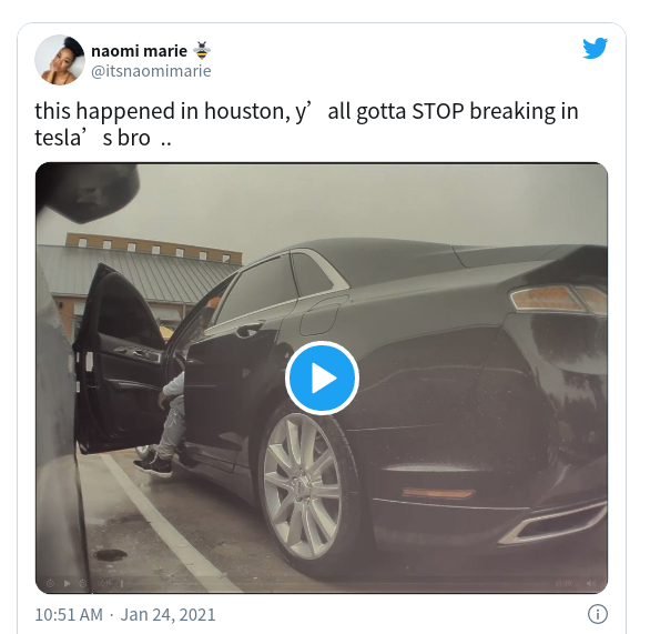 犯罪分子如果看到车舱内有东西遗留,特别是手提包或箱子,往往会破窗而入。这起事件发生在休斯顿,被拍了下来:一名男子从车上下来,向停车场内的特斯拉车窗看去。在他发现车内有一个钱包后,他拿着某种工具破坏了玻璃。然后,犯罪者按压车窗,使其破碎。袭击者抓起包,上车逃离犯罪现场。