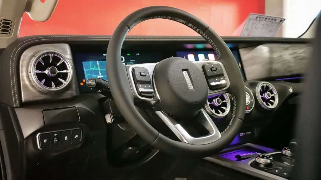 来到车内,精致的金属质感与氛围灯的搭配,营造出了与外观大相径庭的分裂感,时尚与科技的元素,让人很难与它充满硬汉气质的造型联系在一起,甚至比很多城市SUV更懂“城里人”的潮流与风格。