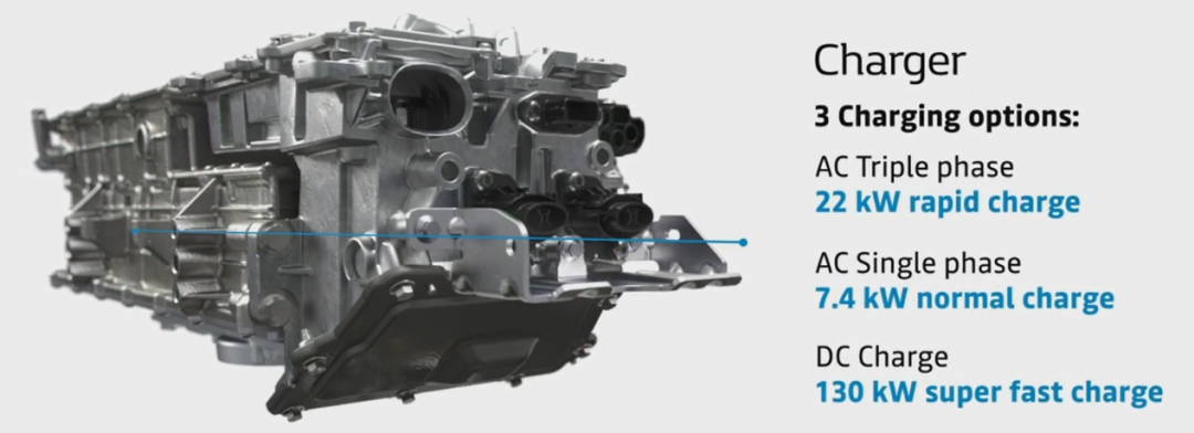 在充电系统里面,继承了22kW的三相充电机,把支持130kW直流快充的控制单元和接触器集成在里面。