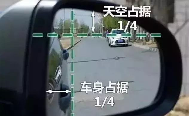 右后视镜调整:可以把头挪到车内中央区域(前排两座位中间),再将右后视镜向外展开,以1/4下3/4,左1/4右3/4(1/4面积靠近车身),能看到后车门的门把手时停止调节。