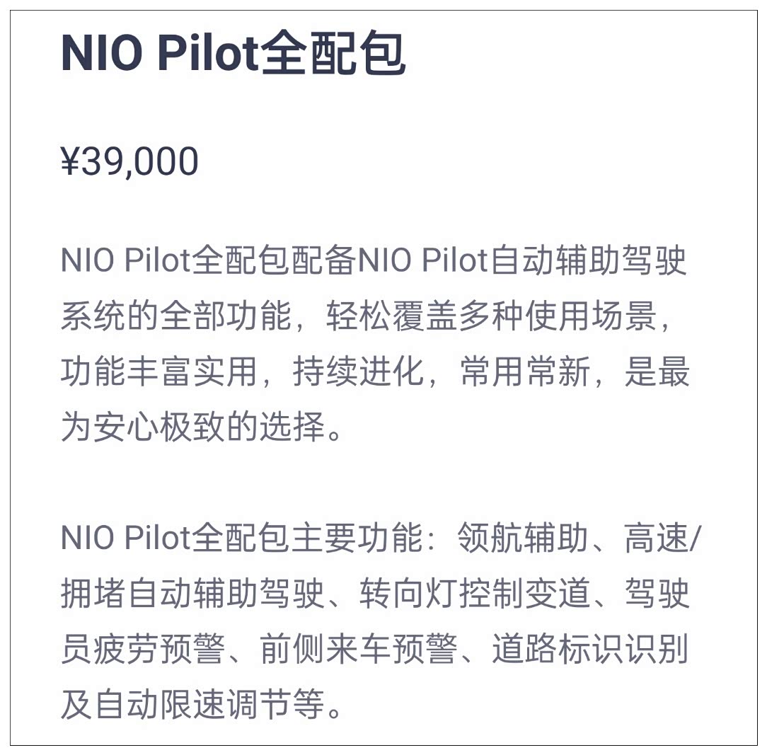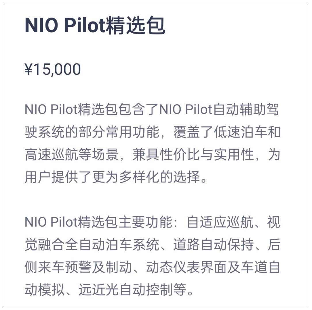蔚来针对驾驶辅助功能提供的选配分为两种,即NIO Pilot精选包和NIO Pilot全配包,其中售价15000元的精选包就已经包括了自适应巡航和车道保持等功能,这类功能属于基础的L2级驾驶辅助功能,与自动驾驶相去甚远。
