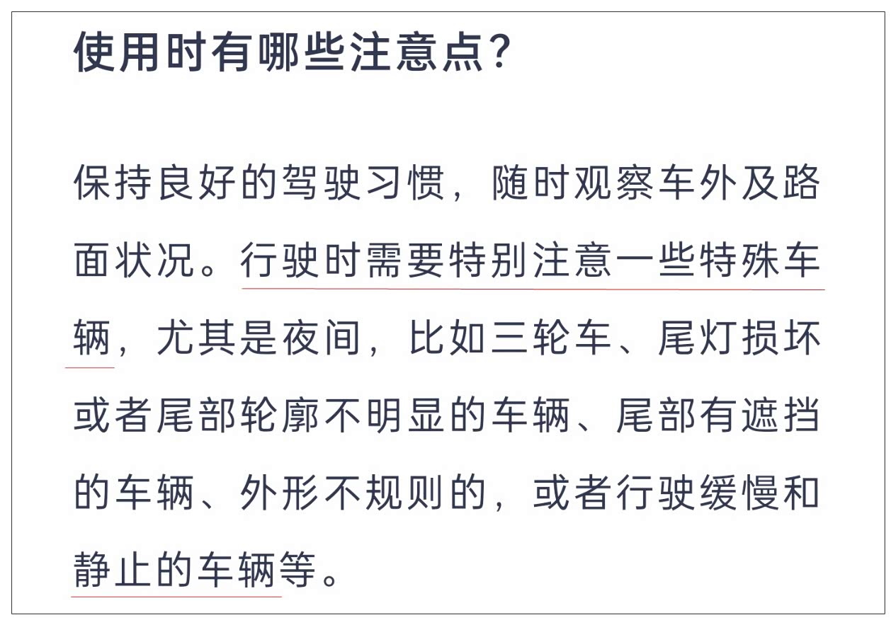 作为一名汽车从业者,我比大多数消费者更了解驾驶辅助功能的能力范围,可是大多数消费者理解吗?在启用这些先进功能,将车内外人员的生命托付给这套系统前,他们能够准确了解说明书简单几行字背后复杂多变的路况和使用场景吗?拥有划时代的先进技术,要做的不止是宣传卖点,更要坚持对车主的教育,保持对功能的不断优化。