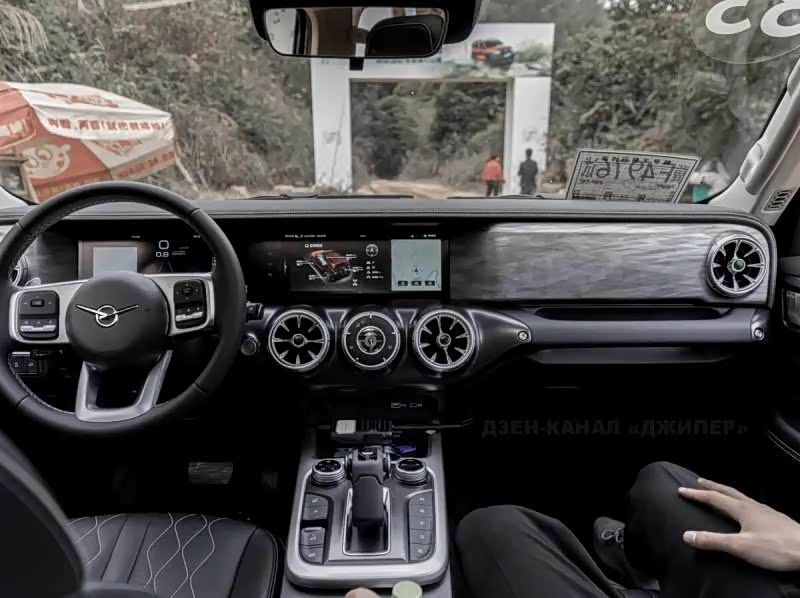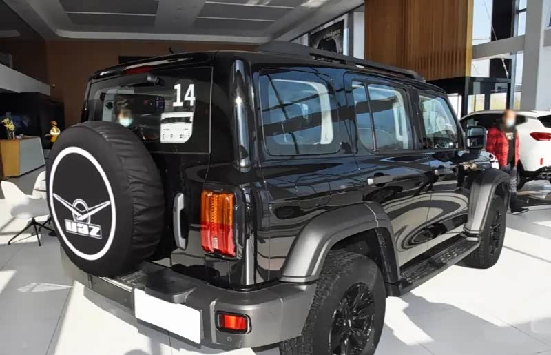 该车中网、备胎罩、方向盘都已经贴上UAZ的logo,放大可发现,前摄像头位置放在了中网左侧,而不是居中位置。国产坦克300备胎中心的后摄像头,在UAZ版上应该也改变了位置。