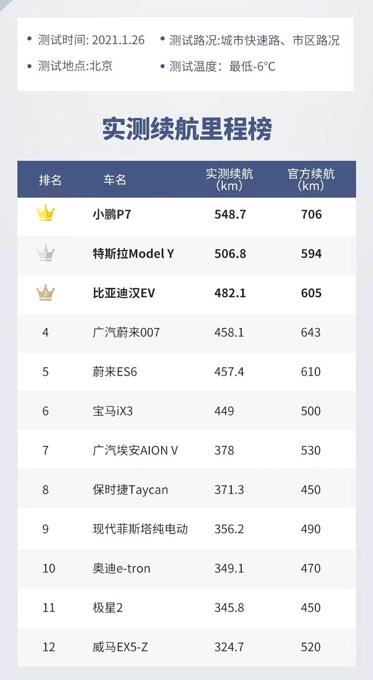 续航里程排名第一的是小鹏P7,官方标定的续航里程是706公里,实际测试续航是548.7公里,排名第二的是特斯拉model Y官方续航是594公里,实际续航是506.8公里,排名第三的是比亚迪汉EV,官方续航是605公里,实际测试为482.1公里。