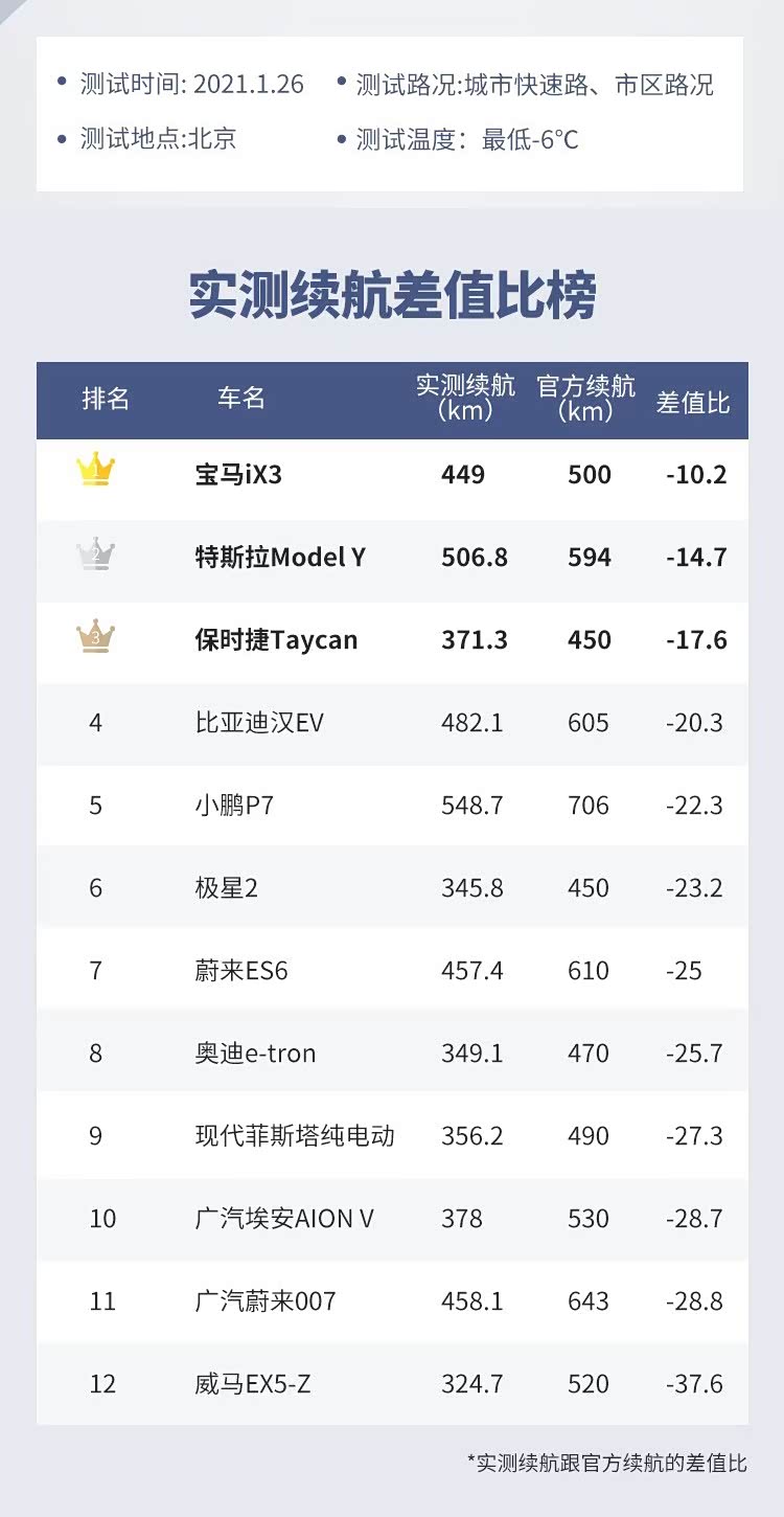 而在实际续航里程与标定里程的差值比的榜单中,这个榜单当中差值比越小的就说明实际续航与官方的测试里程越接近,那么在这个榜单当中,成绩最好的是宝马iX3,差值比只有10.2,排名第二的是特斯拉model Y差值比是14.7,而比亚迪汉EV的差值比是20.3。