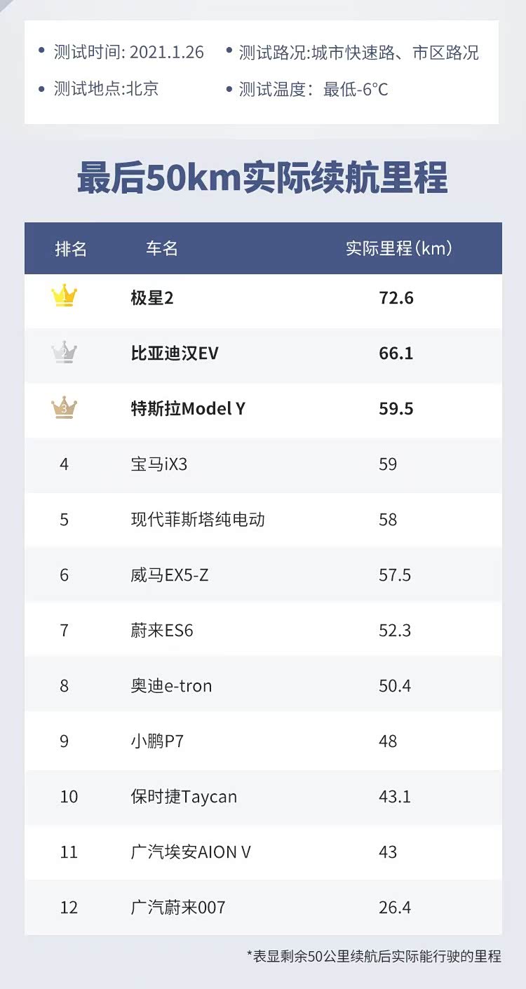 最后50公里的实际续航里程方面,表现最好的是极星2,它的实际续航里程是72.6公里,排名第二的是比亚迪汉EV,实际续航里程66.1公里,第3的是特斯拉model Y,实际续航里程是59.5公里。