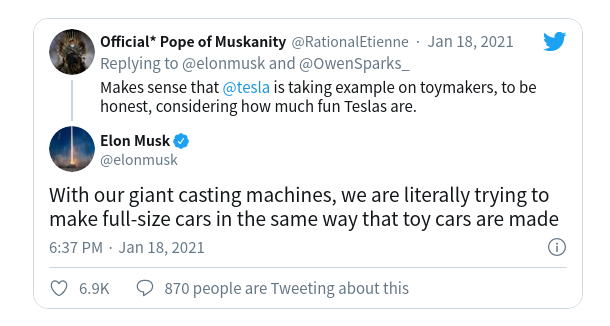 也就是说,当马斯克在Battery Day上展示了Model Y的单片式后部和前部车底铸件时,怀疑论者表示,一体成型的生产概念已经死了。然而,随着马斯克最近的推特,很明显,特斯拉仍然在追求单体特斯拉汽车的想法。
