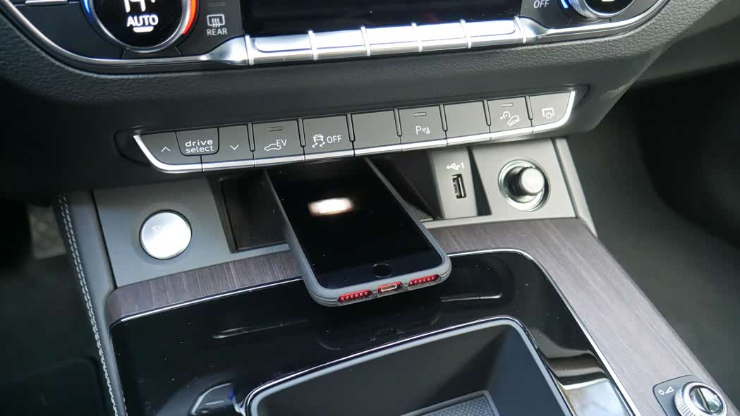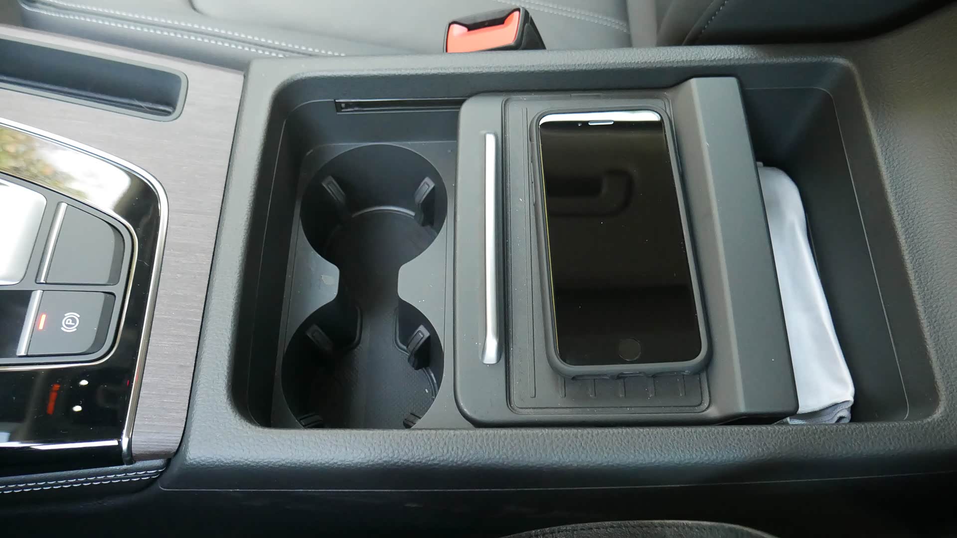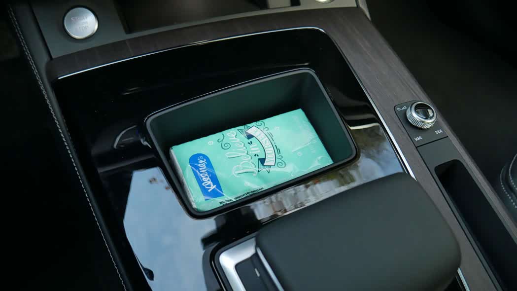 你还必须在使用杯架和将物品放在扶手下的储物箱之间做出选择,因为该储物箱有一个滑动盖,可以同时充当无线充电器 。